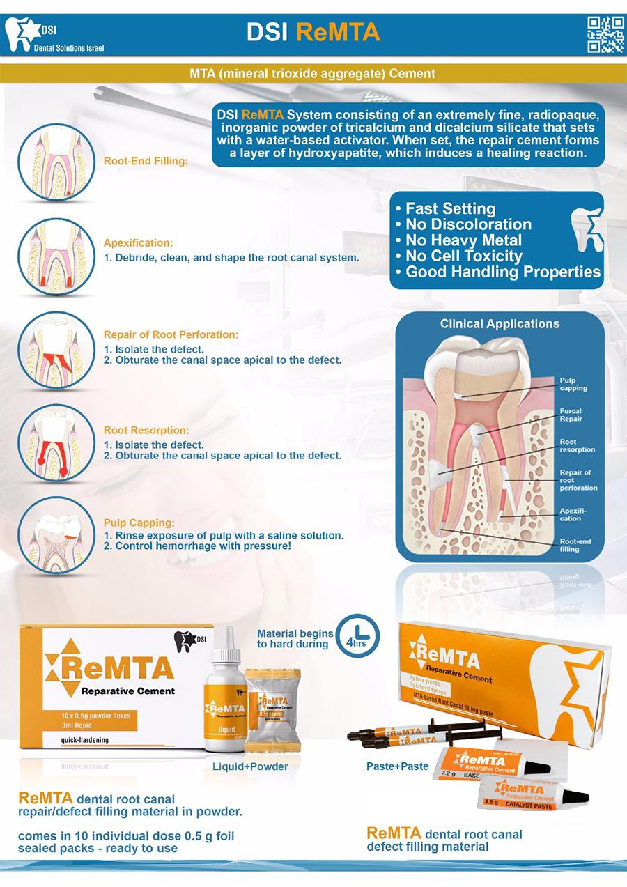 DSI ReMTA is a long-lasting bioactive cement used for pulp capping and root end reversing fillings; it is a hydraulic bio-ceramic material for repair that is essential in pulp therapy. DSI ReMTA dental material is extremely useful for retrograde filling, filling the upper top segment of the canal, closing root canal perforations, and pulp isolation. The powder-liquid version of DSI ReMTA is a powder with good hydrophilic particles that set in the presence of water. It closes off the pathways that connect the root canal system to the surrounding tissues, significantly reducing bacterial migration. Calcium, silicon, and aluminum oxides are the primary constituents of DSI ReMTA material. Copper-calcium hydroxide, an active bacteriostatic additive, is also present in the material. It is monomer- and resin-free, resulting in zero shrinkage. There are no heavy metal additions. DSI ReMTA provides predictable results and curative responses that dentist specialists are familiar with and rely on.DSI ReMTA enhanced packaging reduces waste with appropriate 0.5-gram pouches and corresponding liquid to syndicate just the right amount for single-and multiple patient's uses.ts outstanding compatibility with the dentinal wall gives an expected clinical healing response, and its water-based chemistry permits normal setting in the inclusion of moisture. In the case of treating teeth with unformed roots, calcium hydroxide stimulates apexigenesis and osteogenesis, inhibits bone reabsorption, and promotes dentinal bridge formation with regard to pulp covers.