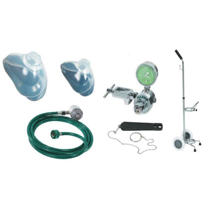 Includes: "E" Cylinder Cart, Demand Valve, 50psi Regulator, Child Face Mask, Adult Face Mask, Cylinder Wrench (Cylinder Not Included)