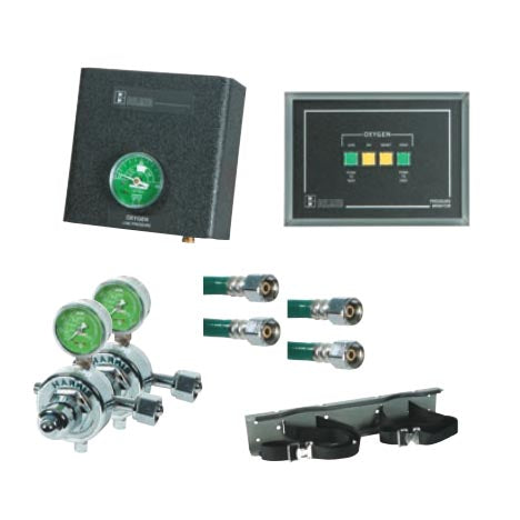 2 Oxygen Cylinders Wall Alarm System. Includes: Manifold, Alarm, Transformer, Cables, Regulators, Hoses, Tank Restraints