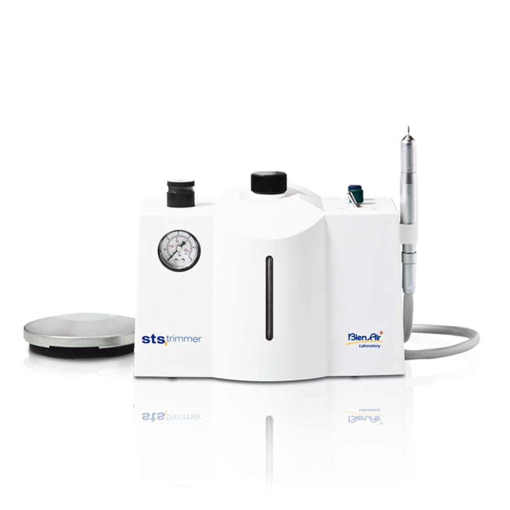 The Bien Air Air Turbine with Water is a tool for ceramics and prosthetics. Made and manufactured by Bien Air, this pneumatic unit is known for its robustness and ease of use.  One of the standout features of this air turbine is its STS-Trimmer unit. This unit is equipped with a 1.4 Litre tank that allows autonomous operation for extended periods of time. With separate switches, you can easily adjust the flow rate and air/water spray mixture for optimal cooling. In combination with turbines that have a dustproof shield and Friction Grip chuck, the Bien-Air air-driven assemblies provide you with the best long-term performance.