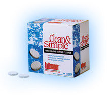 Sold in Cases of 12 Boxes Of 64. Clean & Simple is an ultrasonic/ enzymatic solution dispensed in a unique tablet form. Drop 2 tablets into your ultrasonic tank already filled with tap water and the tablets will dissolve in about a minute. This is a non-ionic solution which is non-corrosive, non-toxic, biodegradable and non-caustic.