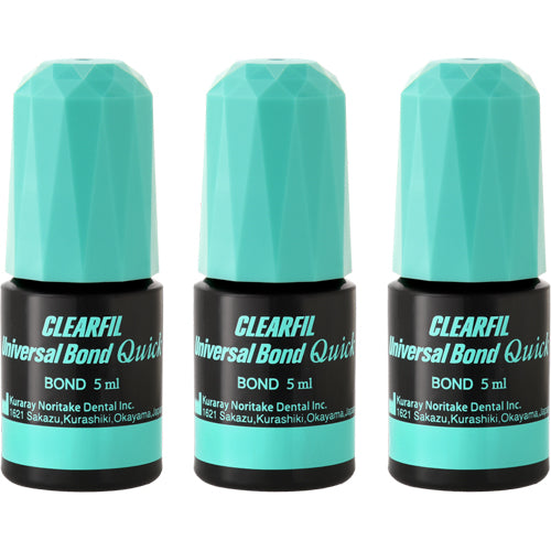 Clearfil Universal Bond QUICK - Value Pack: 3 x 5ml bottles universal adhesive. Indicated for use with all etching techniques and light, self or dual-cure materials. Can be mixed with CLEARFIL DC Activator to become a dual-cure adhesive, thereby making this product truly “Universal” for all etching and restorative needs. (Replaces item 3293KA )
