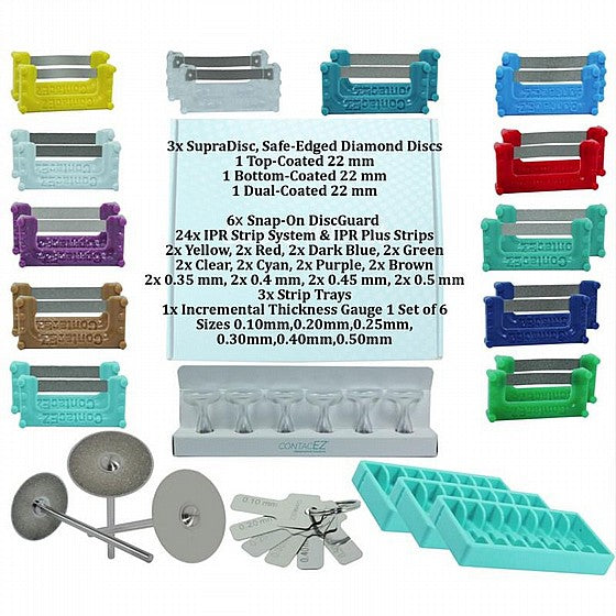 Package Include: Top-Coated SupraDisc, Bottom-Coated SupraDisc, Dual-Coated SupraDisc, 6 Snap-On DiscGuard, 24 IPR Strip System, and IPR Plus Strips, 3 Strip Trays, Incremental Thickness Gauge of 6 Sizes.Types: