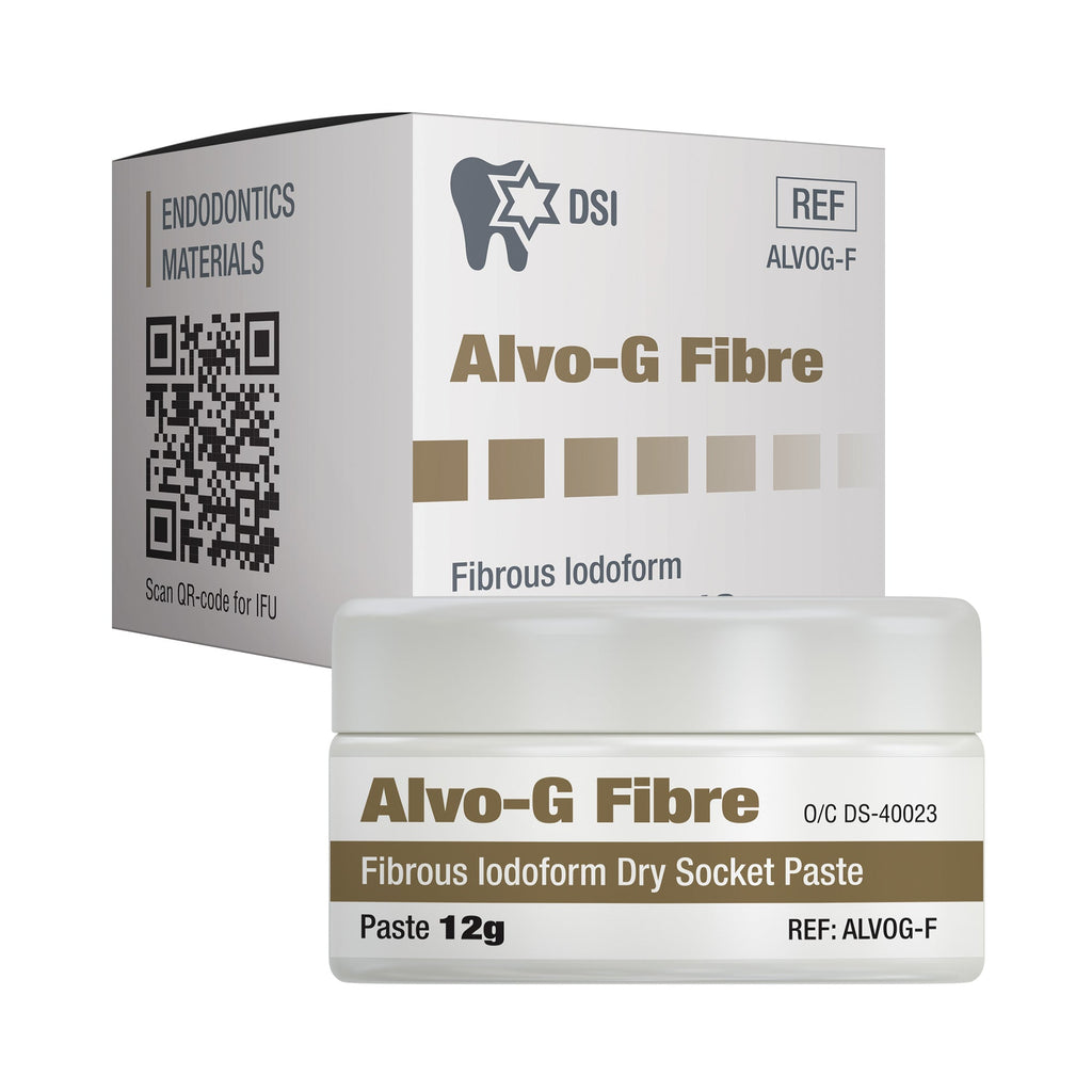 DSI Alvo-G Fibre is a special paste that is used for dry socket treatment and post-extraction dressing. It boosts the healing process and avoids complications from tooth extraction. The constituents in this paste provide analgesic and anti-microbial effects, shielding alveolar tissues. Additionally, there are analgesic and anti-microbial elements such as; eugenol, butamben, and iodoform within the paste which help to expand its healing properties.