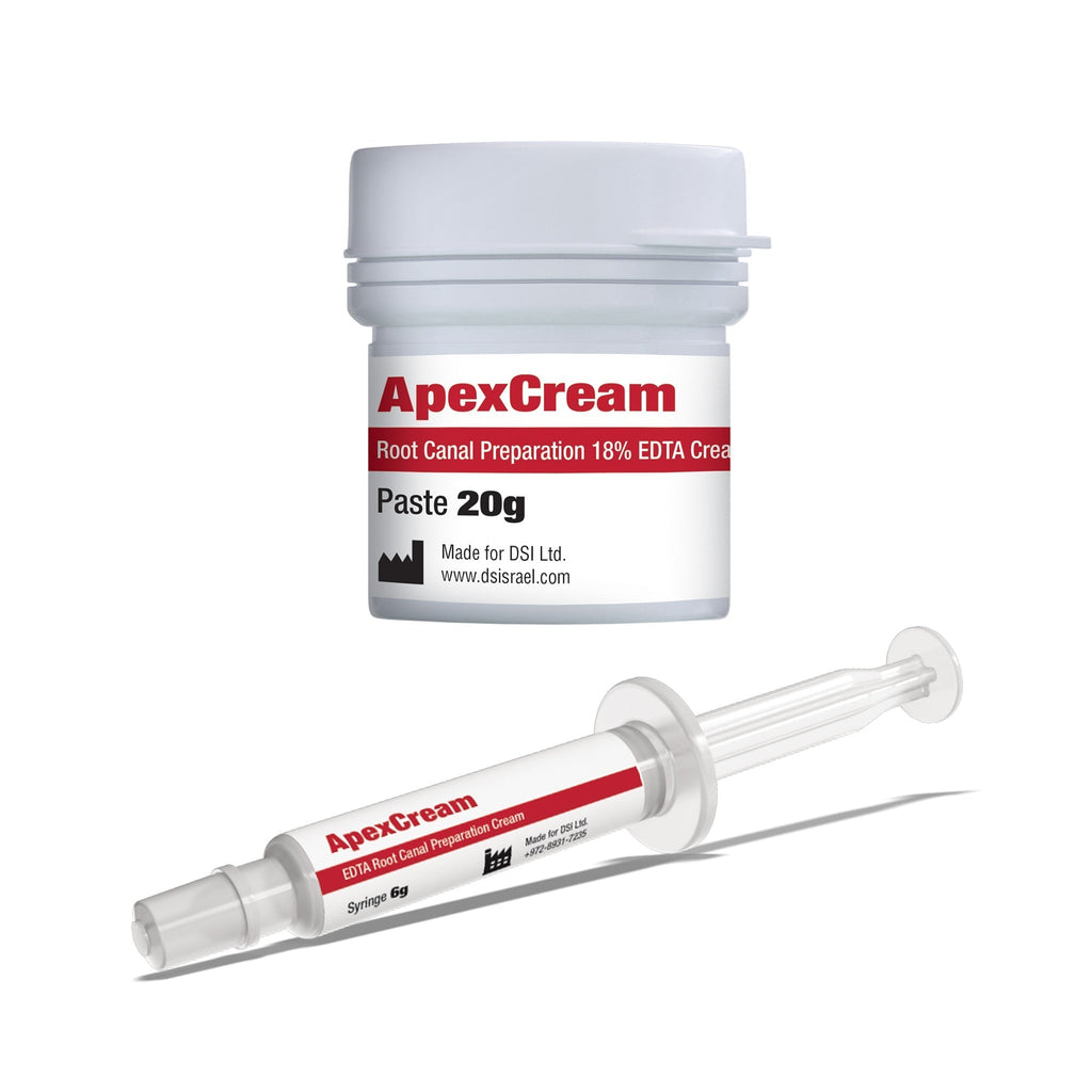 DSI ApexCream EDTA 18% Endodontic Cream is a versatile solution for root canal cleaning and preparation. It removes the smear layer by binding calcium, for effective endodontic procedures. It contains urea peroxide and disodium edetate to soften tissue and aid in mechanical drainage. Surfactants make insertion easier and reduce the risk of damage. It expands the canal, removes the smear layer, chelates dentin, and eliminates calcified blockages. Its special formula ensures clean and smooth canal walls, that are ready for treatment.