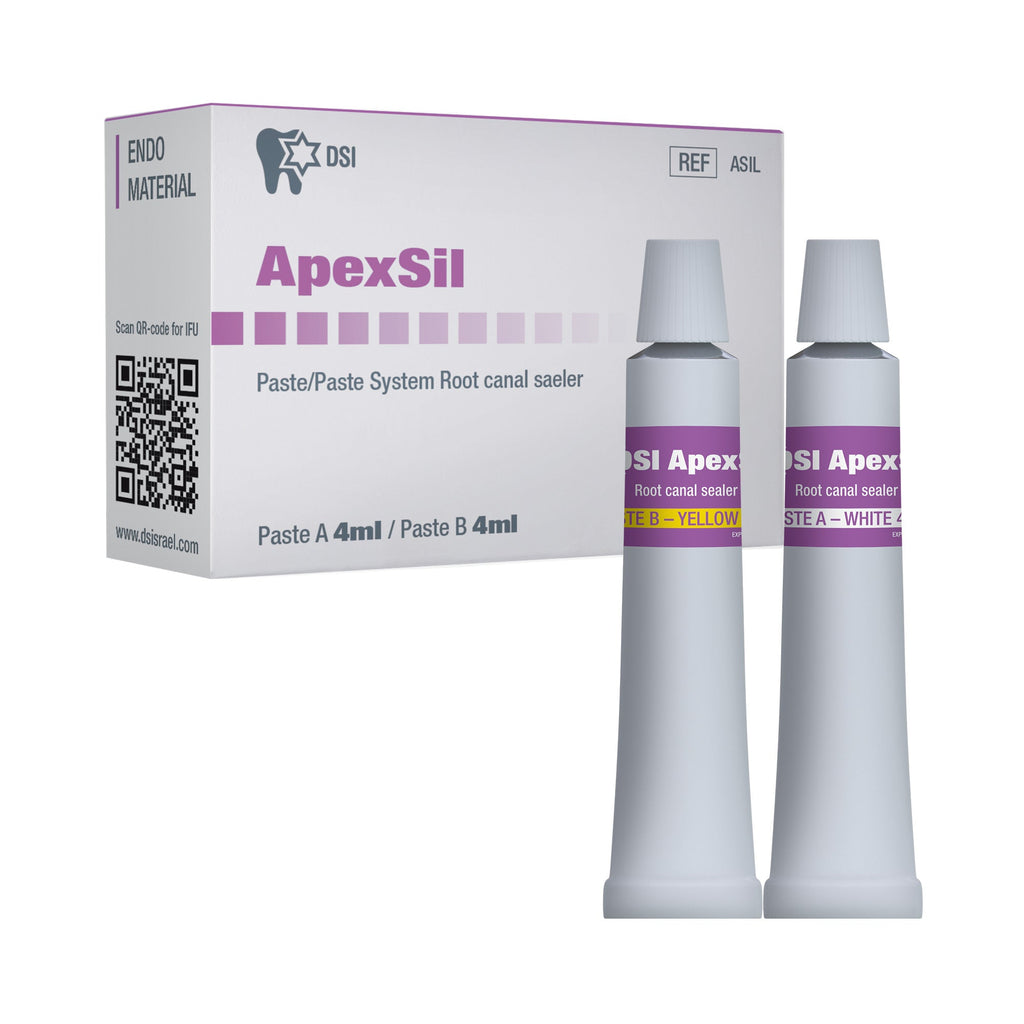 DSI ApexSil is a highly radiopaque, 2-component root canal filler, delivered in two tubes. The components are dioxide, zirconium oxide, amine hardening agents, plasticizers, and color pigment. It can be used for permanent obturation of root canals of teeth in combination with root canal points, or with gutta-percha, silver, and titanium points.