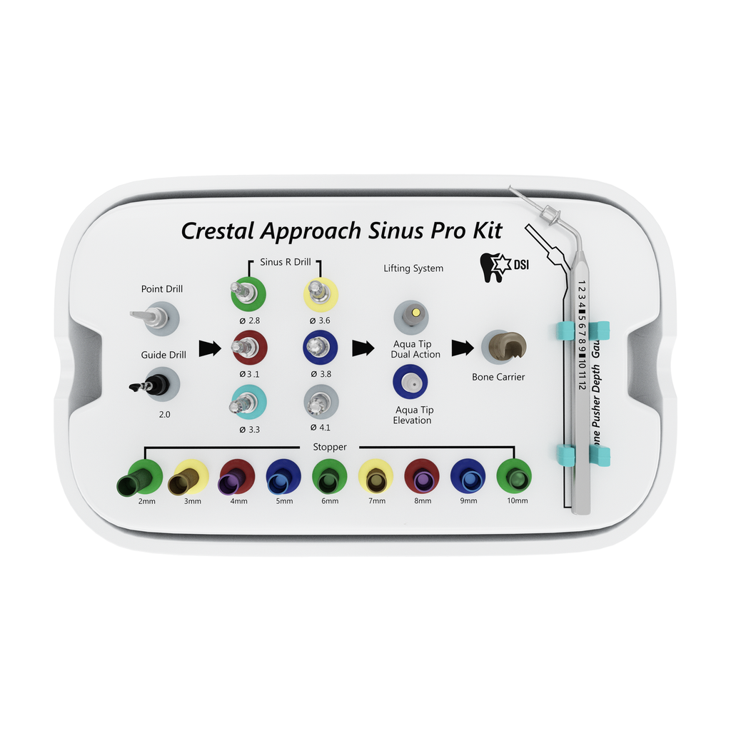 DSI Crestal Pro-Kit provides excellent results, a faster procedure time, a shorter healing period, and, higher comfort for both you and your patient, without damaging the sinus membrane. It also saves your chair time thanks to the perfectly designed and carefully chosen tools - including dual tip with worldwide patent.