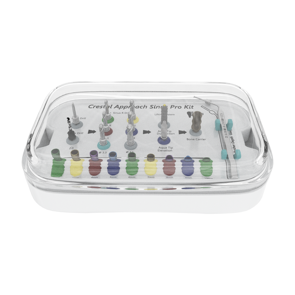 The DSI Crestal Pro Kit is designed to provide a crestal sinus approach for sinus lift, which offers a more effective and safer procedure than other methods. This toolkit includes tools for sinus lifting and it is ideal for any dental professional that needs an uncomplicated technique for performing closed sinus lifting procedures. DSI Crestal Pro Kit comes with dual action aqua tip providing a unique solution for raising the sinus membrane. This is a patented tip designed to make the sinus lifting procedure more efficient and easy. The tip fills the sinus pocket with liquid and pushes the membrane. The liquid comes out on both sides of the tip. There is also an option to push the membrane with the silicone tip that comes out, then continue to push the membrane with liquid.