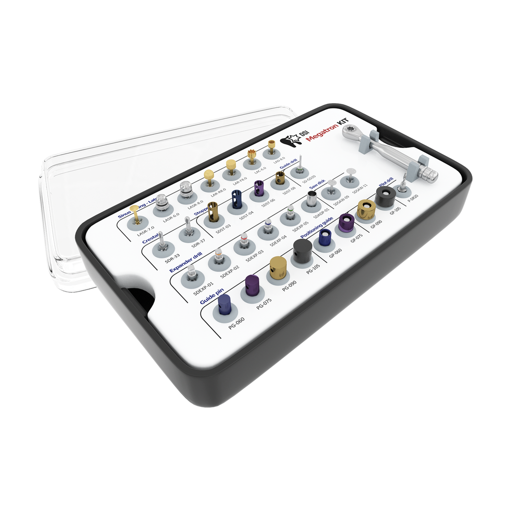 The DSI Megatron Universal Surgical Sinus Lift Ridge Split Implant Guide Positioning Kit is a complex and completely universal kit that includes all the necessary instruments to perform lateral & crestal sinus lifting in addition to manipulating narrow bone ridge expansion. It also includes implant positioning guides for simplified precise freehand implant placement. This kit is designed in collaboration with professional maxillofacial surgeons and specialists in implantology. It can be used for lateral and crestal sinus approaches and all the items for all those procedures are included in one kit. It means that instead of using and sterilizing 3 or sometimes even 4 different kits for each of those procedures, you do it once. DSI Megatron saves an enormous amount of time and it is the most cost-effective set of tools on the market.