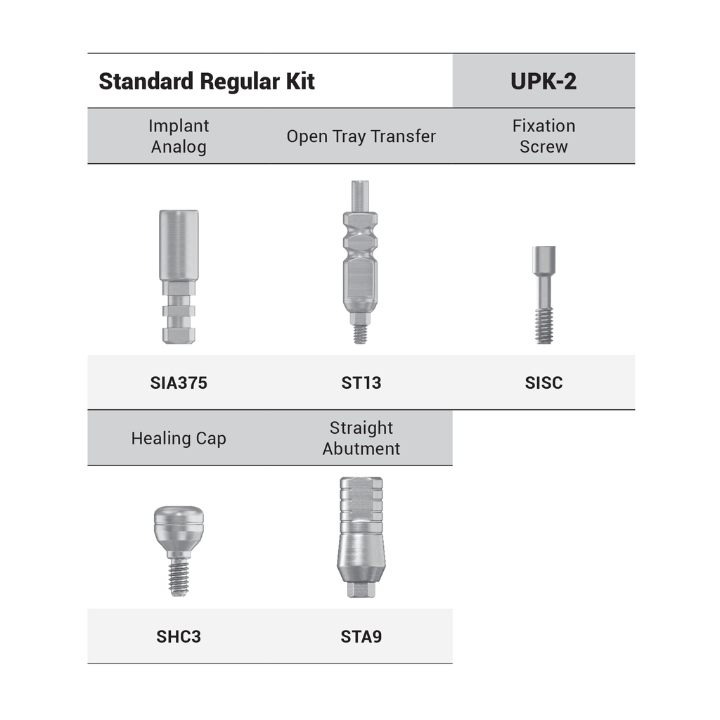 • Lab analog, impression coping, healing cap, final abutment, prosthetic screws included