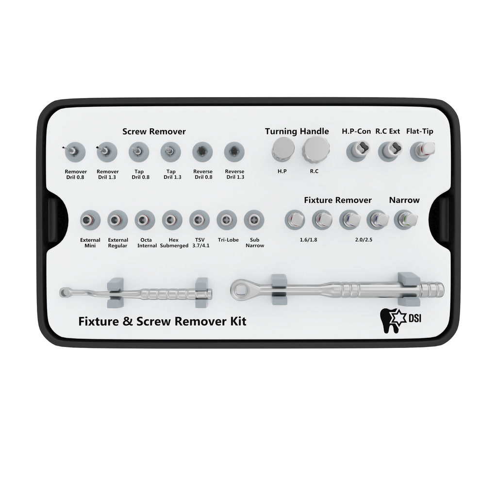 DSI Implant & Screw Removal Kitis designed specifically for the extraction of broken, ill-fit, or misplaced implants. As well as removing and extracting a broken or fractured fixation screw from the implant's inner thread. This is not an invasive solution without the need for surgical intervention. The procedure is fast, reliable, and not traumatic for the patient. When the broken screw is lifted from the implant it then can be replaced by a new prosthetic solution with a new fixation screw.