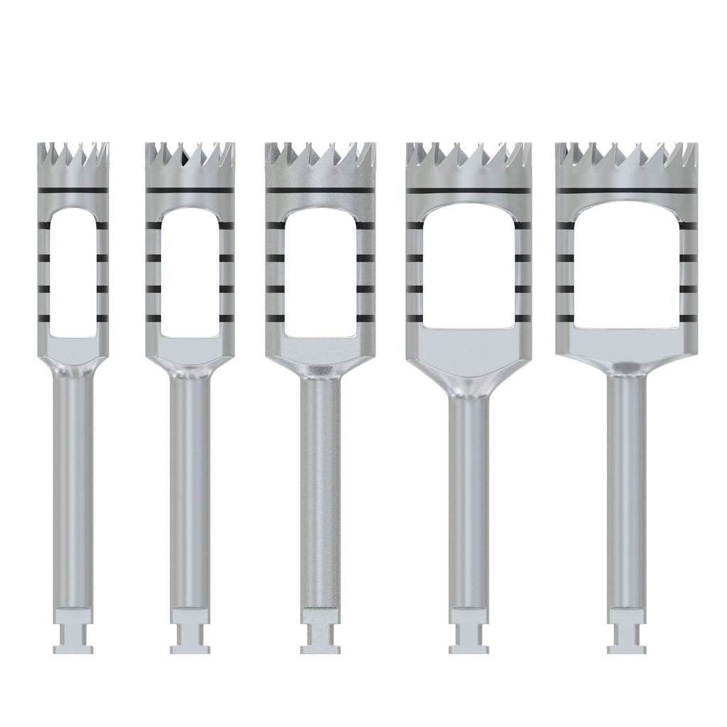 The drills prevent damage to the bone since they only touch a single point at its apex. They have laser-marked score lines to determine the depth of the socket and are perforated for better air circulation and reduced heat generation.