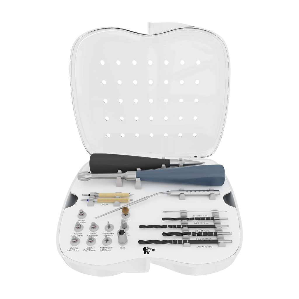 The DSI Zygomatic surgical drill kit developed especially for zygomatic implant socket preparation and includes all the necessary items for convenient operation. The kit includes long cylindrical coated drills that are made with the highest durability and deliver exceptional functionality. This kit includes high-end surgical tools and is designed in a very specific manner for zygomatic implant installation. All the instruments are made of the best raw materials on the best CNC machines, delivering the highest quality and reliability. DSI Zygomatic surgical will give you extremely high accuracy, low vibration, and minimum heat generation allowing quiet, easy, and comfortable work time after time.