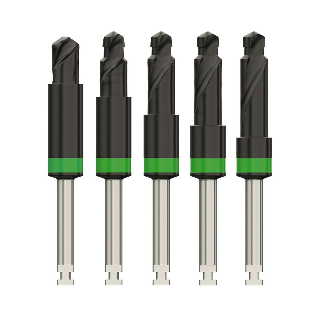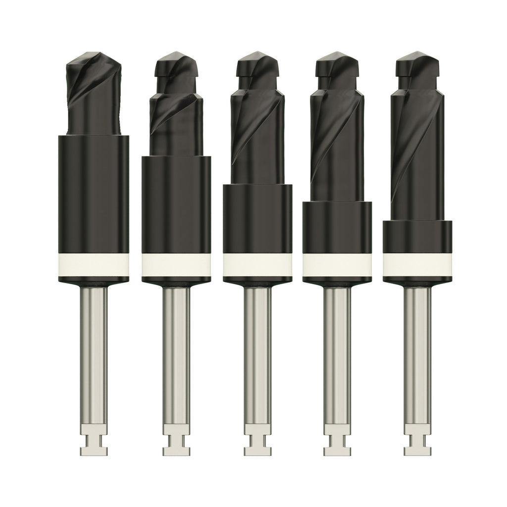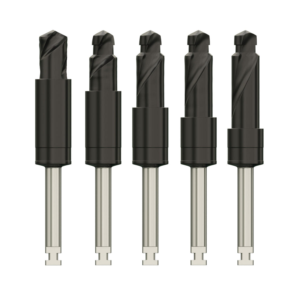 DSI Step&Stop drills are the most efficient instruments for precise drilling. These drills are uniquely built with each drill leading the following for fast and accurate drilling. The drill dimension and shape reflect the closest match to the implant geometry. It benefits from a built-in integral stopper, perfect balance, and an optimized cutting edge with a Diamond-like Carbon DLC coating.