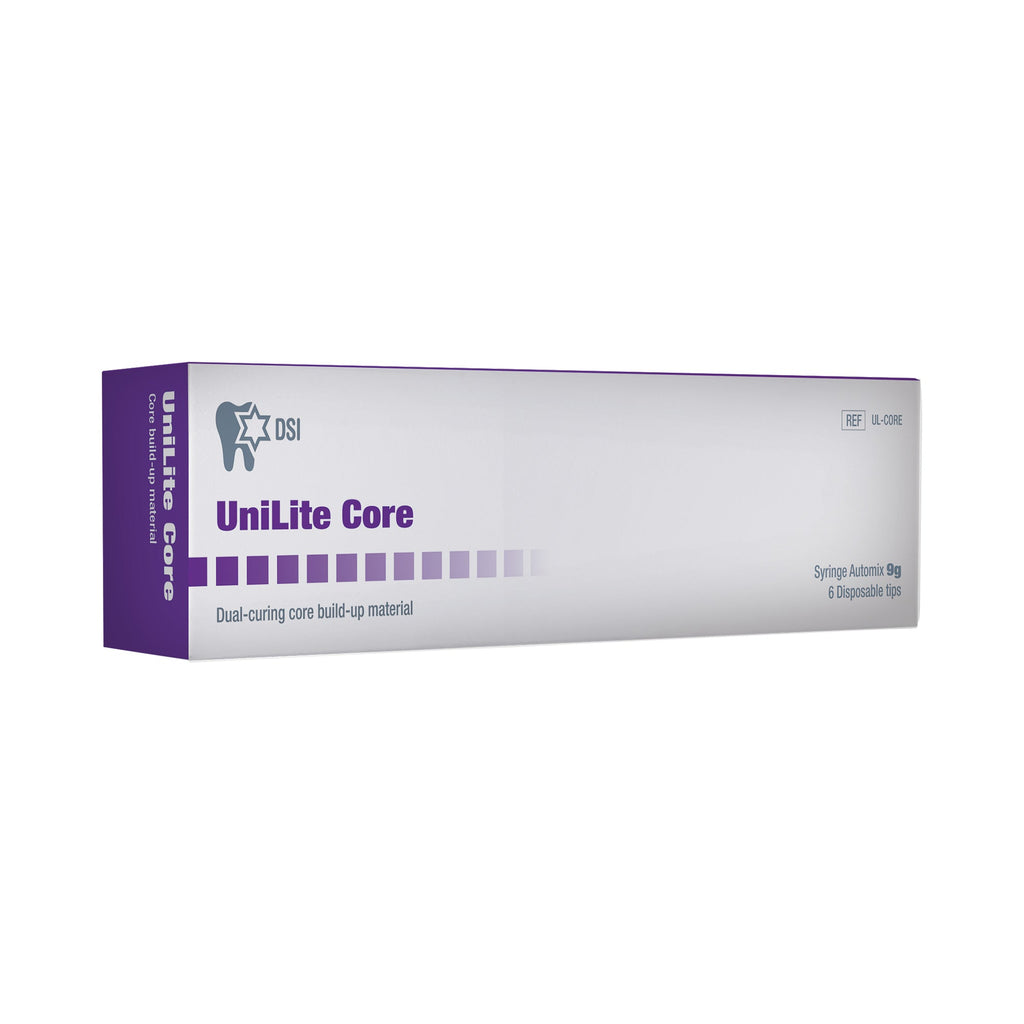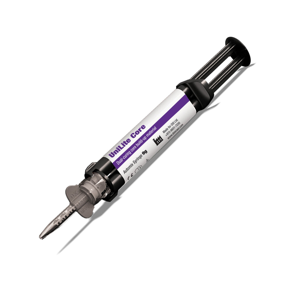 Packaged in a convenient 9g syringe, DSI UniLite Core is a premixed, radiopaque two-component material delivered via an efficient automix system. It stands out with superior compressive and flexural strength, ensuring enduring reliability in core restorations.