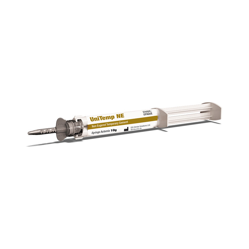 DSI UniTemp NE is a non-eugenol temporary cement, made for temporary crowns, bridges, and trial cementation of permanent restorations. Delivered in a convenient Automix syringe, it requires no mixing, offering a convenient application. Its remarkable adhesive properties ensure a secure hold on temporary materials while permitting easy removal from prepared teeth. The non-eugenol formula guarantees compatibility with resin-based fillings or luting materials, preserving their setting process. Particularly suitable for individuals with allergic sensitivities, thanks to its zinc oxide and organic acid-based composition.