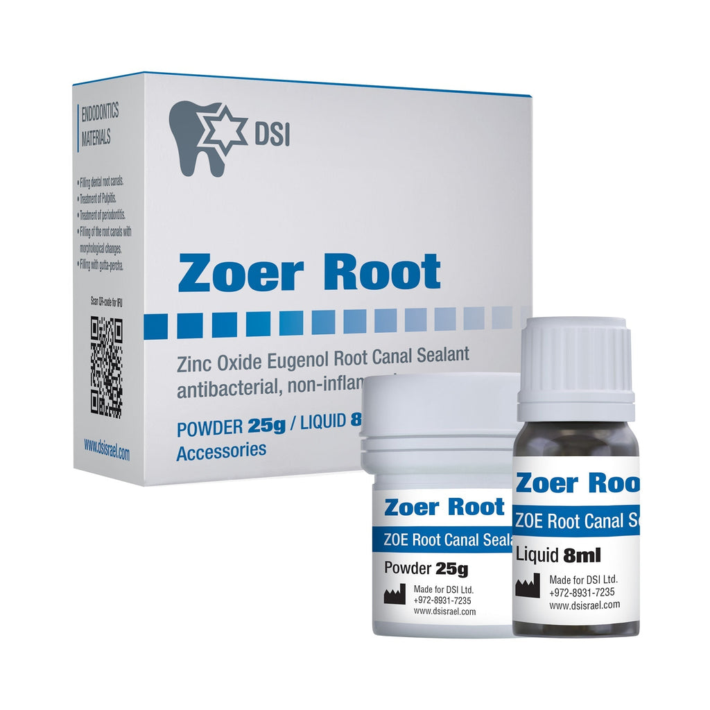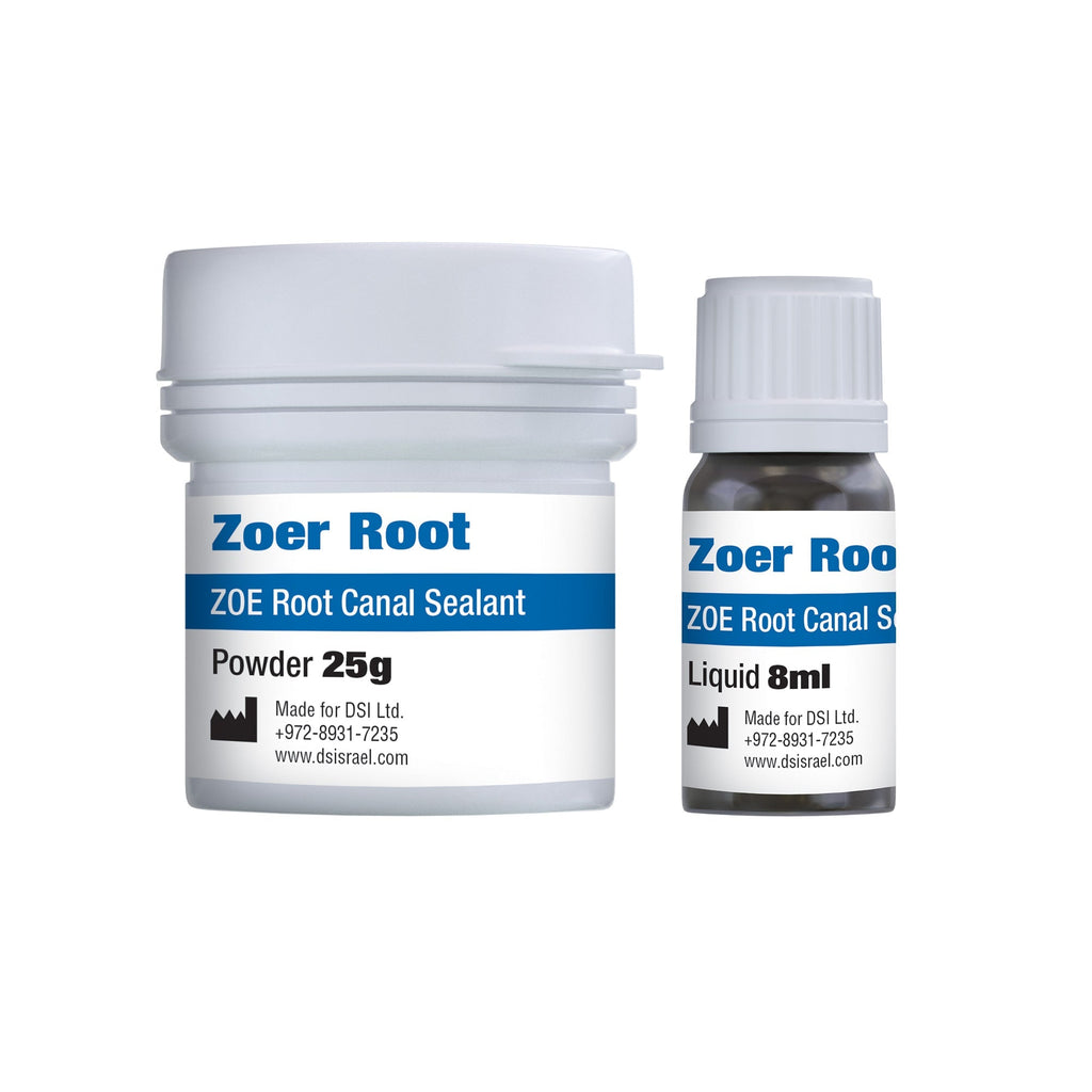 DSI Zoer Root Canal Sealer is an antibacterial, non-inflammatory sealant designed for filling root canals. It can function as a root canal sealer or serve as a base or lining under restorative materials such as amalgam, silicate, silicophosphate, and glass ionomer.