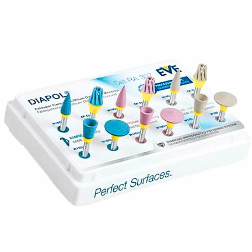 The EVE Diapol set RA 307 12 angled diamond silicone polishers are a porcelain polishing set to provide high-quality polishing results for porcelain restorations. This set is an economical option that does not compromise on quality. The set includes 12 angled diamond rubber bands to provide a finish for porcelain restorations. These silicone polishers have a comfortable size and shape that allows for easy access to hard-to-reach areas in the oral cavity, ensuring that every part of the restoration receives the same level of polishing.