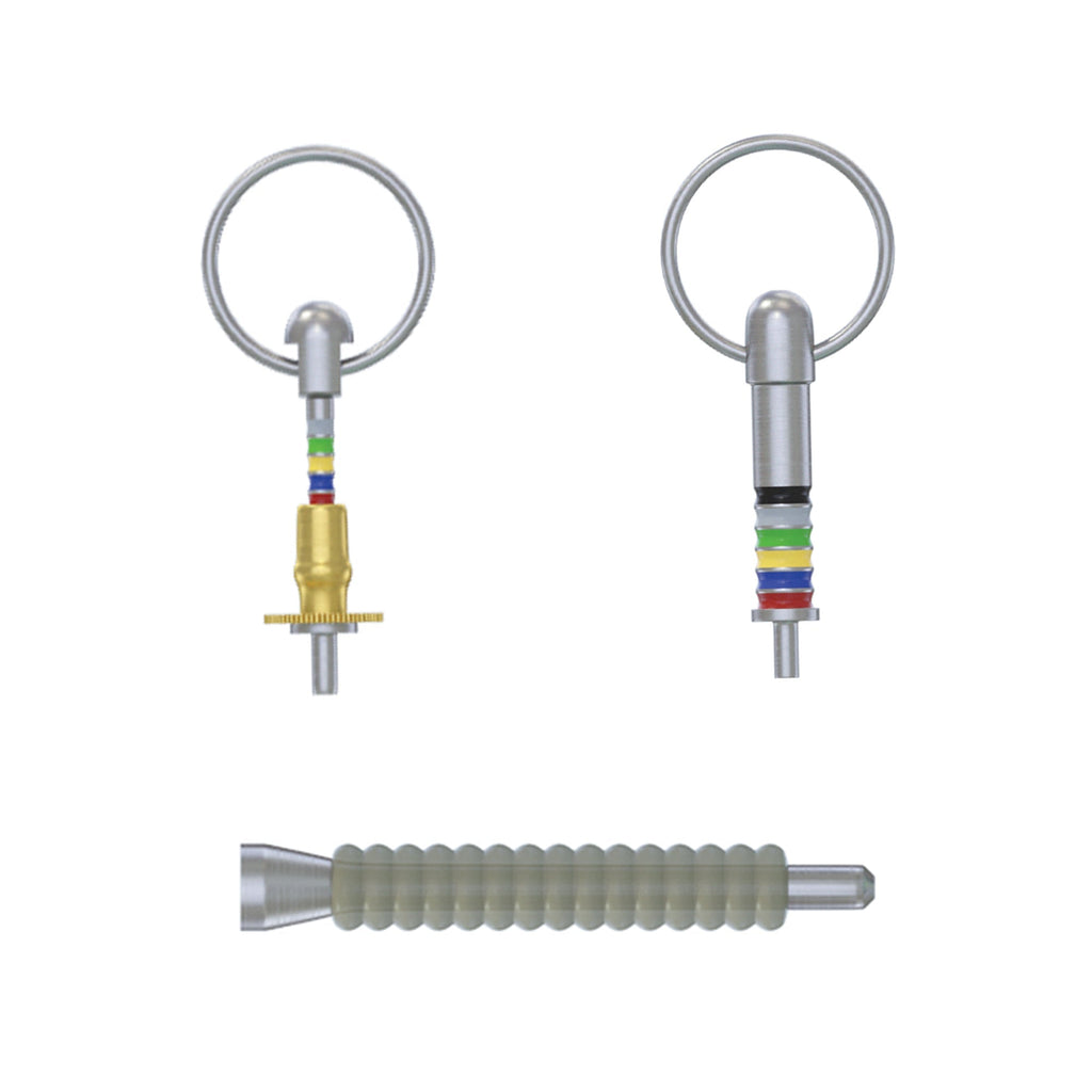 The kit includes a threaded pin with a ball indicator and a stationary pin, ensuring reliable results in all measurement endeavors. The stationary pin is particularly advantageous in tight spaces between implants. The 20 silicone rings further enhance its utility by offering precise depth measurements.