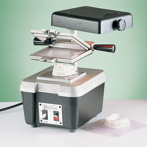ProForm Vacuum Former, 220 Volt for international plugs/outlets. Single Chambered, Aluminum Construction, 5 Year Warranty, Made in the USA. Symmetrical heating element provides uniform heat distribution and rotates 180 degree for access. Hexagonal post keeps sliding frame from twisting. Space-saving size - only 13 1/2" tall. Produces dozens of useful thermoplastic appliances such as mouth-guards, niteguards, TMJ splints, bleaching trays, temporary crown and bridge forms, retainers and more.