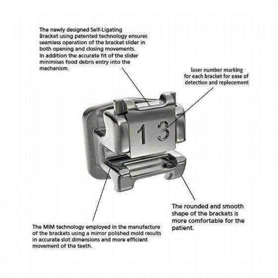 Self-Ligating Brackets are similar to traditional metal brackets but have a significant advantage. Their clever design does away with the need for elastic rubber bands. Instead, a spring-loaded door precisely secures the archwire, improving treatment efficiency and predictability. Passive Self-Ligating Brackets are your go-to solution for a wide range of orthodontic cases because they are designed for maximum precision, predictability, and efficiency. They instill trust and dependability in achieving the best possible smile result. Choose Self-Ligating Brackets for a more precise and predictable smile transformation.
