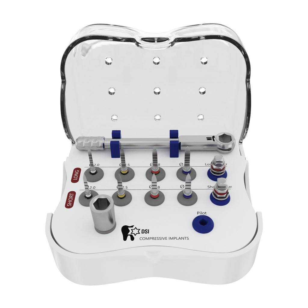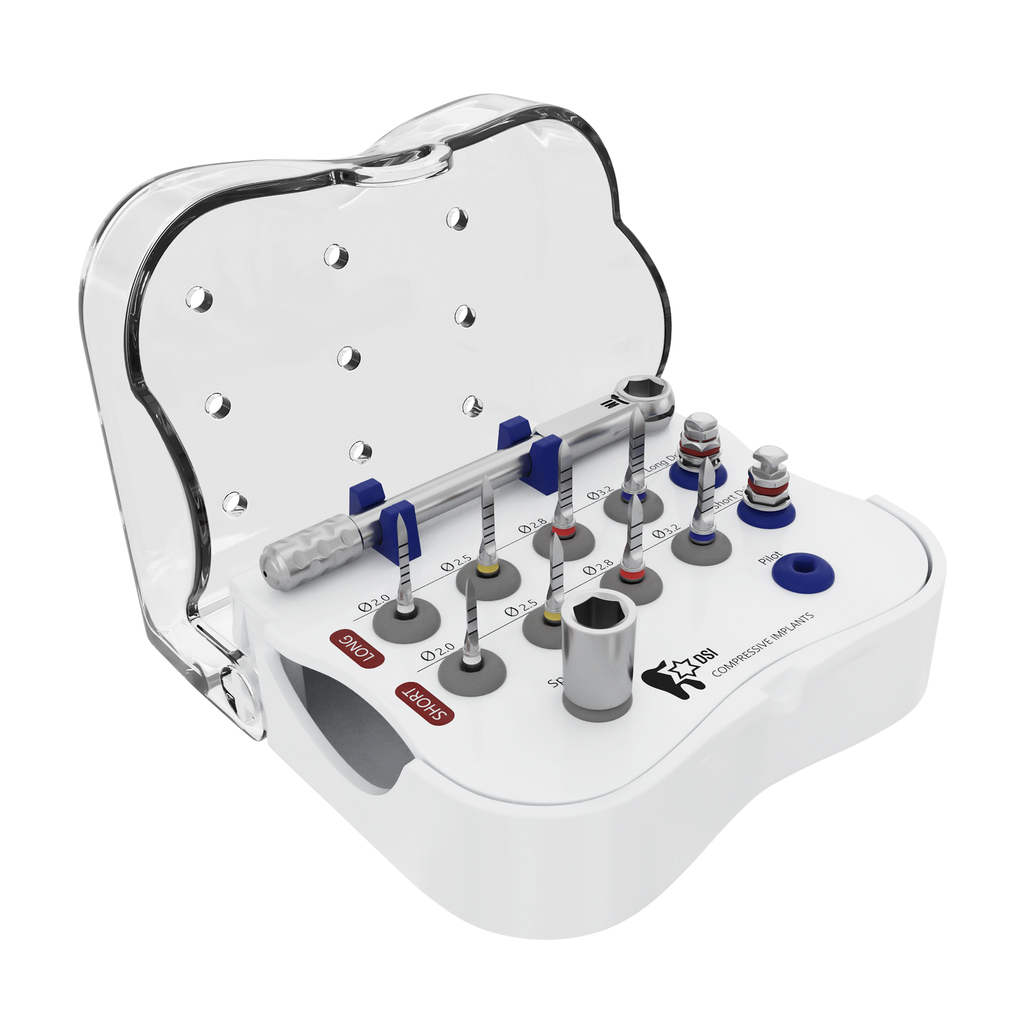 The DSI Surgical Kit For MCB/ROOT Implants is made especially for drilling the initial socket in the cortical bone in order to install One-piece MCB and ROOT implants. This kit allows you to operate with significance, accuracy, and ease of use. It is very convenient and simple and has the lance drills in order to penetrate bone in order to perform an immediate loading of MCB and ROOT implants. This kit is ergonomically designed, and all the instruments are organized by their layouts and clearly labeled. Drills are arranged with the drilling protocol in mind for an intuitive feel. DSI manufactures the best surgical tools, using the highest quality raw materials available worldwide. The drills are characterized by rigidity and durability.