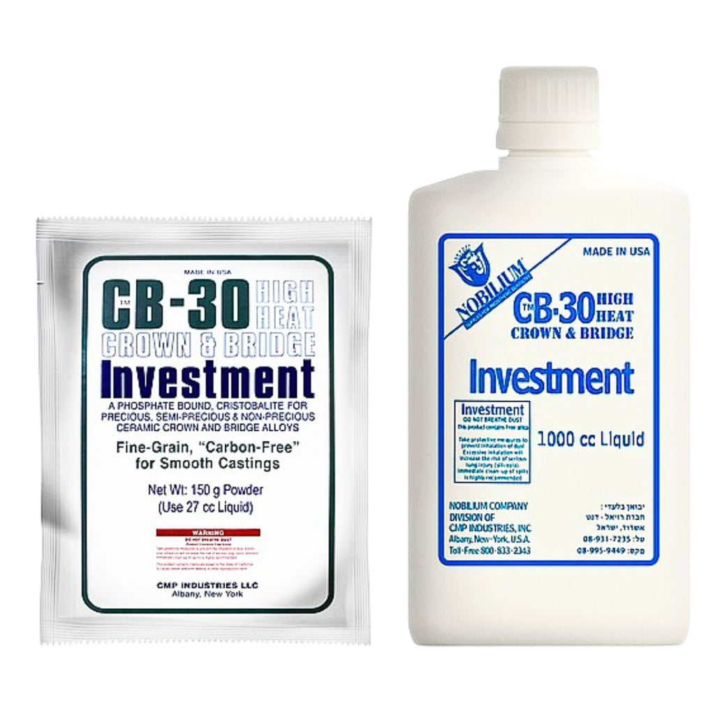 Made for use with ceramic gold, semi-precious, and nonprecious crown & bridge alloys, CB-30 is a high-heat, oxy-phosphate investment with a refined grain. This “carbon-free” grain, combined with its temperature-immune liquid binder, allows for controlled expansion and yields smooth castings. One of the features of CB-30 is its ability to cast most alloys without the need for a ring. Its high strength also contributes to improved casting surface finish and accuracy. The investment has a controlled mixing reaction that prevents unwanted bubbles, ensuring a smooth and bubble-free casting every time. Its fine grain, with the consistency of heavy cream, makes it easy to work with and achieve consistent results.