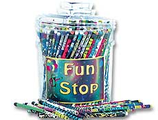 An assortment of 288 pencils that both girls and guys will love. There are pretty pencils, sporty, funny, whacky, and a whole lot more.Warning: Chocking Hazard. Small parts. Not for children under 3 yrs.