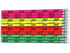 Our Neon pencils come in 4 assorted colors with smiley teeth. Warning: Chocking Hazard. Small parts. Not for children under 3 yrs.