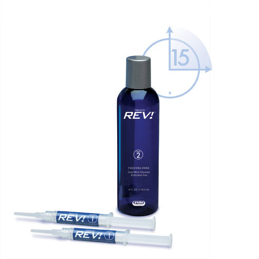 CONTAINS: Two 3cc syringes with 4oz (118.3ml) REV!, Finishing Rinse, Whitening Toothpaste . 15 minutes, once a day to your whitest smile! - - - Step 1 - REV! Gel This patented 14% hydrogen peroxide formula delivers proven whitening results1 with the shortest wear time of any professional whitening product. REV! gel is water based to hydrate the teeth as it whitens and to avoid thermal sensitivity naturally. - - - Step 2 - REV! Finishing Rinse This refreshing mouth rinse is formulated for use immediately after REV! gel.