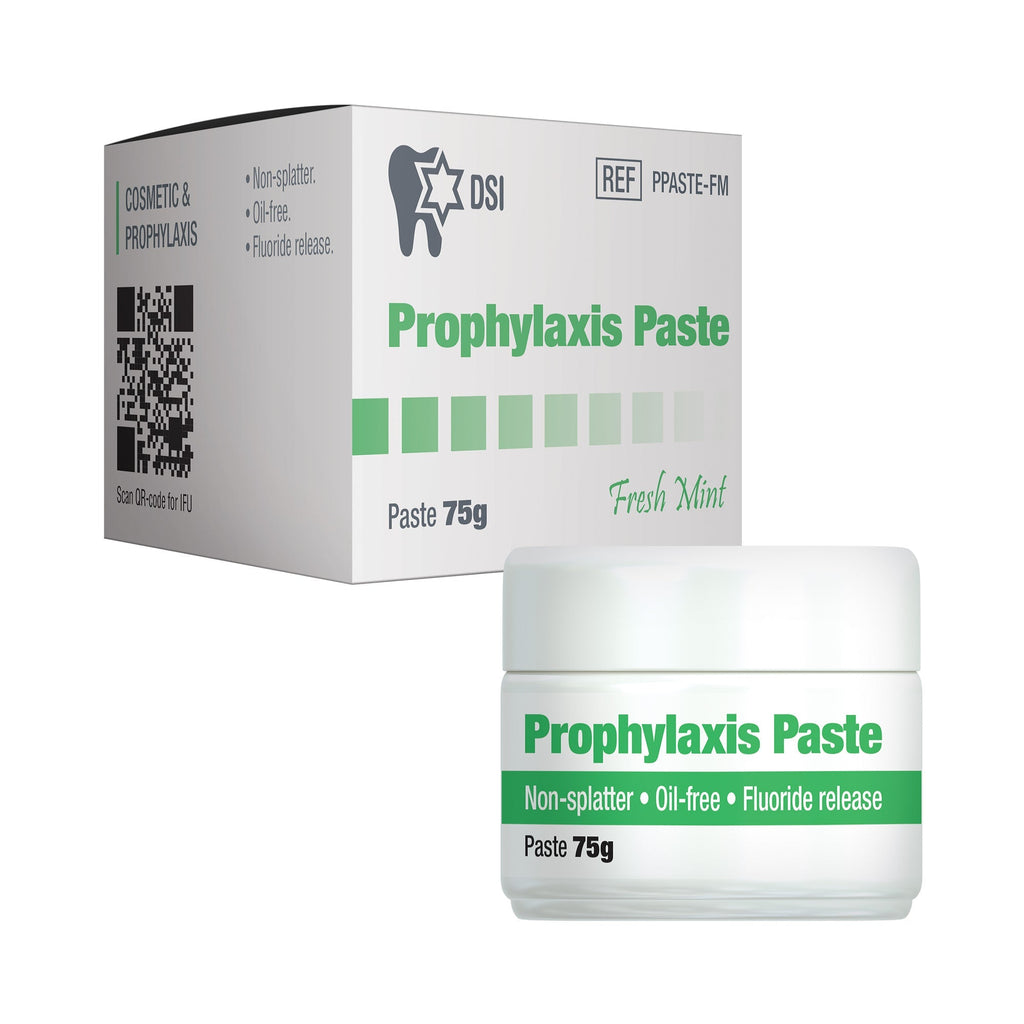 DSI Prophylaxis Paste is a highly effective abrasive paste designed for polishing and fluoridating teeth after scaling. The mechanical action produces a smooth surface while preserving the integrity of the enamel. It is also used for polishing fillings and removal of tobacco & food stains.