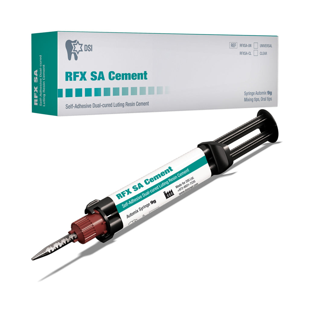 DSI RFX SA dual-cure self-adhesive resin cement is an optimal choice for securing crowns, bridges, inlays, onlays, and posts. This state-of-the-art resin technology presents a user-friendly automix syringe delivery system, boasting some of the most robust retention capabilities among self-adhesive cements.