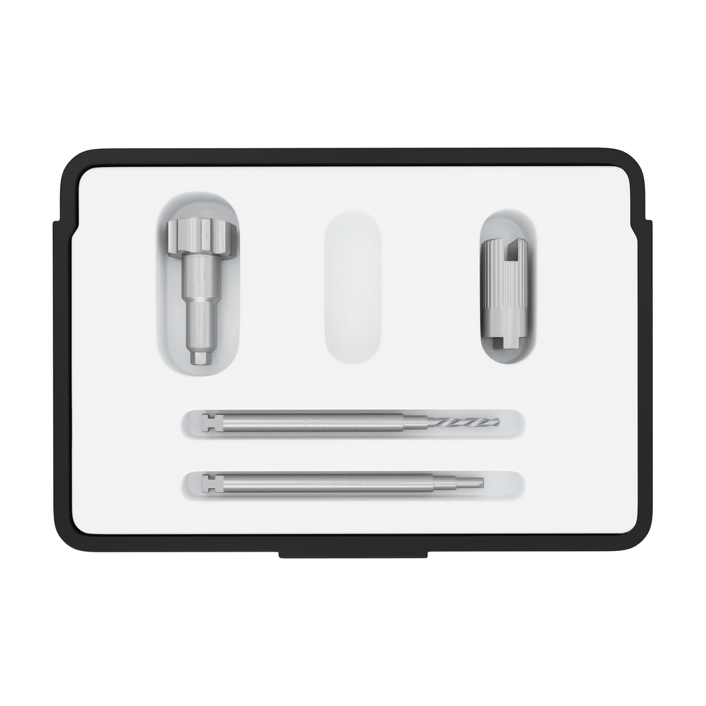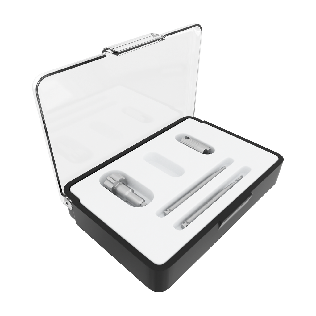 The kit also includes supporting devices such as a centering device for stabilizing the drill during the procedure and a manual extractor.