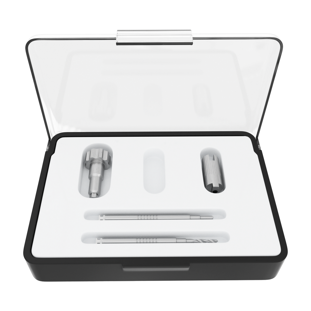Rhein83 Kit For Removal Screws is designed specifically for the extraction and removing a broken or fractured fixation screw from the implant's inner thread. This is not an invasive solution, and there is no surgical intervention. The procedure is fast, reliable, and completely atraumatic for the patient. When the broken screw is extracted from the implant it then can be replaced by a new prosthetic solution with a new fixation screw.