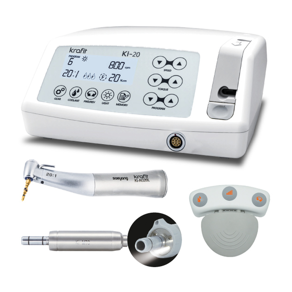 Krafit Ki-20 Physiodispenser Micromotor For Implantation powerful and compact LED implant motor with a maximum speed of 40.000 RPM. Include 9 programs in the memory which enables easy and convenient working conditions. Made with highest quality materials and has an ergonomic and innovative design. The motor is equipped with an improved pump for the physio dispenser with extremely quiet operation.