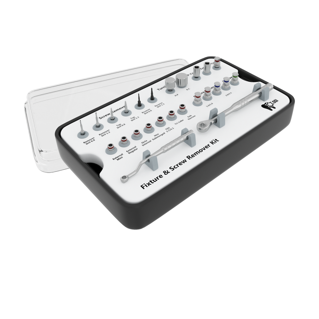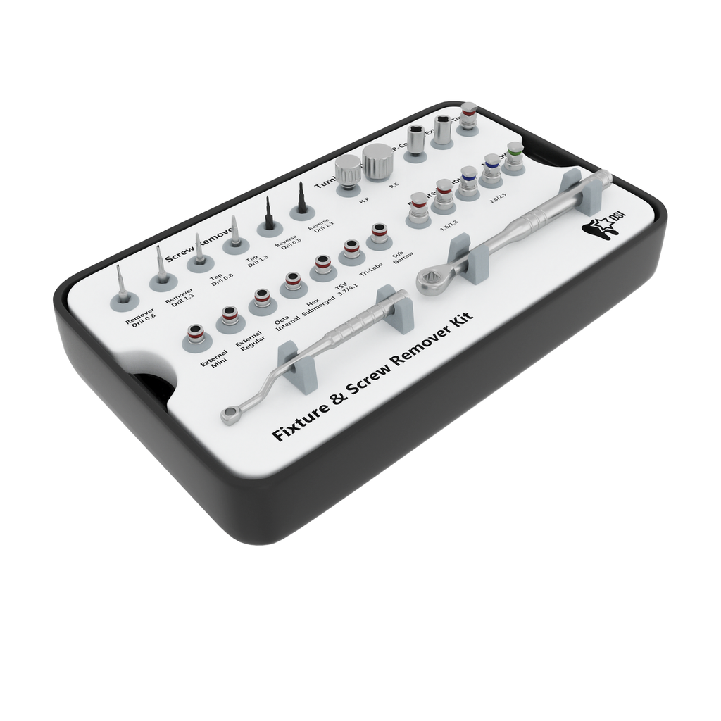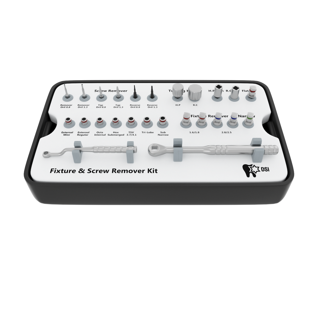 DSI Implant & Screw Removal Kitis designed specifically for the extraction of broken, ill-fit, or misplaced implants. As well as removing and extracting a broken or fractured fixation screw from the implant's inner thread. This is not an invasive solution without the need for surgical intervention. The procedure is fast, reliable, and not traumatic for the patient. When the broken screw is lifted from the implant it then can be replaced by a new prosthetic solution with a new fixation screw.