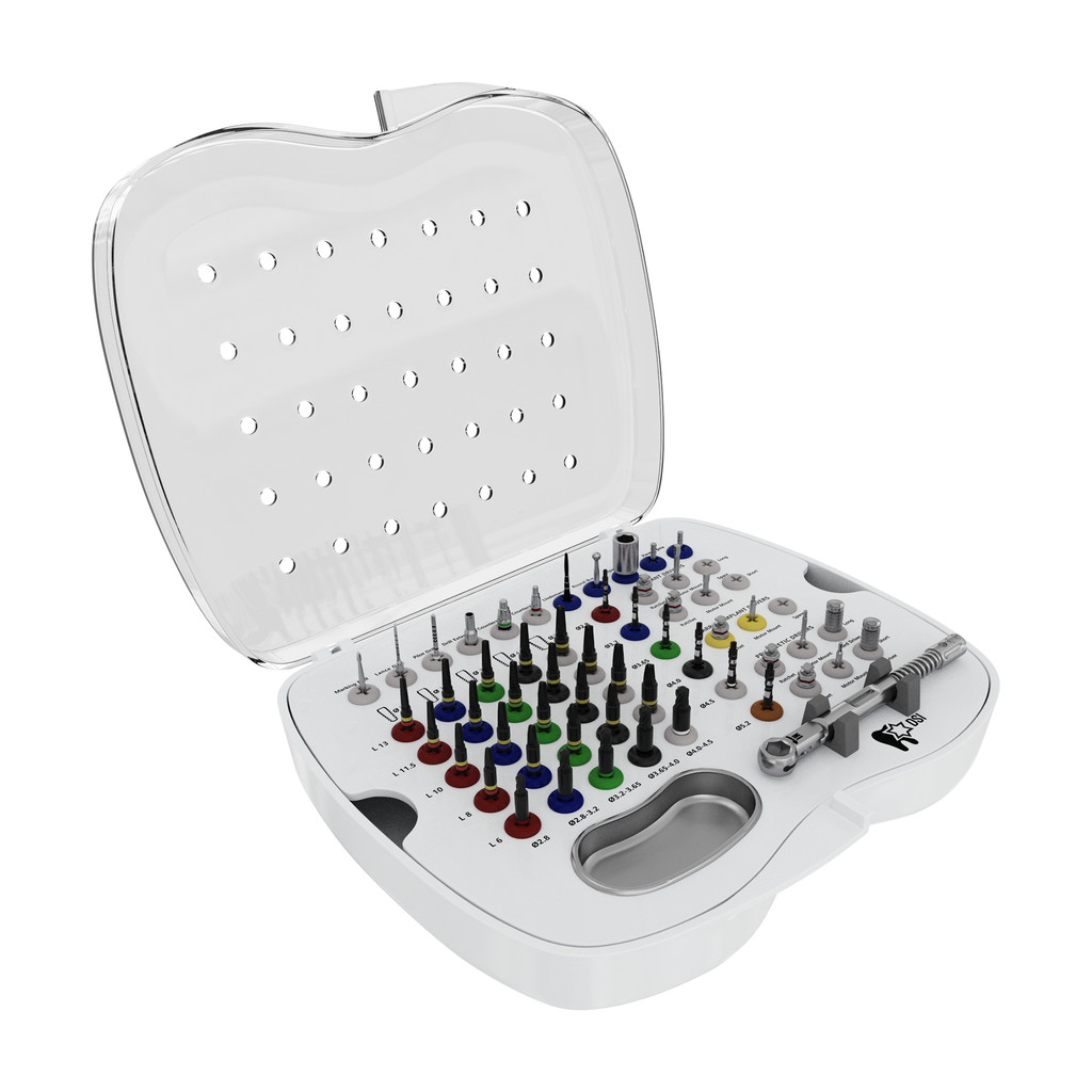 LD150:Lance drill Ø1.5mm PD190:Marking drill Ø1.9mm PD200:Pilot drill Ø2.0mm TDE: Drill extender CD375, CD500: Countersink drills Ø3.75-4.2 and 5.0-6.0mm LD1520: Lindemann drill Ø1.5-2.0mm RB38: Round bur Ø3.5mm MMRA: Motor mount to ratchet adapter SPP100, SPP160: Jag parallel guide pins L 10 and 16mm SD2028L16C, SD2832L16C, SD32365L16C, SD3640L16C, SD4045L16C, SD4652L16C:Step drill with DLC coating Ø2.0x2.8, 2.8x3.2, 3.2x3.65, 3.6x4.0, 4.0x4.5, 4.6x5.2mm L 16mm RDS2015: Ratchet driver for narrow implant Ø2.0mm MM2028:Motor mount driver for narrow implant Ø2.0mm RDK24100, RDK24150: Ratchet driver for implant Ø2.42mm L 10 and 15mm MM24220, MM24028: Motor mount driver for implant Ø2.42mm L 20 and 28mm RDK125070, RDK125150: Ratchet driver for prosthetics Ø1.25mm L 7.0 and 15.0mm MM12520, MM12528: Motor mount driver for prosthetics Ø1.25mm L 20.0 and 28.0mm HDK125070, HDK125150:Manual driver for prosthetics Ø1.25mm L 7.0 and 15.0mm 1000201: Torque ratchet with hexagonal head Ø6.35mm 10-35Ncm RS6111: Surgical torque ratchet with hexagonal head Ø6.35mm 25-100Ncm DPKOP: Depth gauge probe measuring tool PAL94150:Removable stainless steel surgical tray TD280L6SC, TD320L6SC, TD365L6SC, TD400L6SC, TD450L6SC:DLC coated stopper drills Ø2.8, 3.2, 3.65, 4.0, 4.5mm TDC19X27L8CH, TDC19X27L10CH, TDC19X27L115CH, TDC19X27L13CH:Ø1.9-2.7mm L 8, 10, 11.5, 13mm TDC21X33L8CH, TDC21X33L10CH, TDC21X33L115CH, TDC21X33L13CH:Ø2.1-3.3mm L 8, 10, 11.5, 13mm TDC28X37L8CH, TDC28X37L10CH, TDC28X37L115CH, TDC28X37L13CH:Ø2.8-3.7mm L 8, 10, 11.5, 13mm TDC28X40L8CH, TDC28X40L10CH, TDC28X40L115CH, TDC28X40L13CH: Ø2.8-4.0mm L 8, 10, 11.5, 13mm TDC28X45L8CH, TDC28X45L10CH, TDC28X45L115CH, TDC28X45L13CH: Ø2.8-4.5mm L 8, 10, 11.5, 13mm