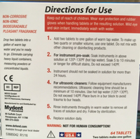 These easy-to-use enzymatic tablets dissolve in a gallon of water in under a minute to create a powerful and effective ultrasonic cleaning solution. Made from a biodegradable, non-chlorine, non-corrosive formulation that contains fast acting protease enzymes. The solution will greatly assist in the removal of blood, bone, tissue, food particles and other soils that may be resistant to chemical detergents. Virtually eliminates handling and storage of heavy liquid concentrates. Contains a pleasant fragrance and is a neutral pH. May also be used as an instrument pre-soak or as an evacuation system cleaner.